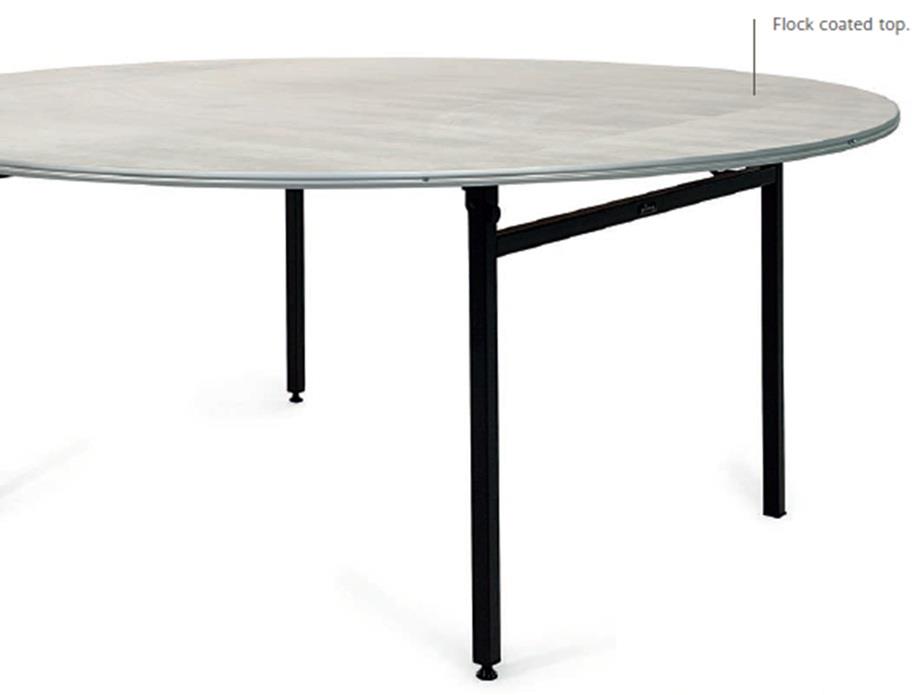 | Столы банкетные круглые (Flock top, banquet table with aluminium edges), размеры: Ø120/150/180 см. У банкетных столов столешницы могут быть выполнены с флоковым шумопоглощающим покрытием или из МДФ (доступны разные цвета ламината на выбор), толщиной от 18 мм, а также есть варианты разной торцевой кромки. Складные ножки и запорный механизм со встроенной защелкой, которая удерживает ножки закрытыми и упрощает хранение, в механизме есть блокировочная направляющая, которая обеспечивает безопасность механизма и предотвращает складывание во время использования. Основание покрыто порошковой краской, цвет на выбор или хромированный вариант. А также, есть выкручивающийся механизм для выравнивания при неровном покрытии пола. |